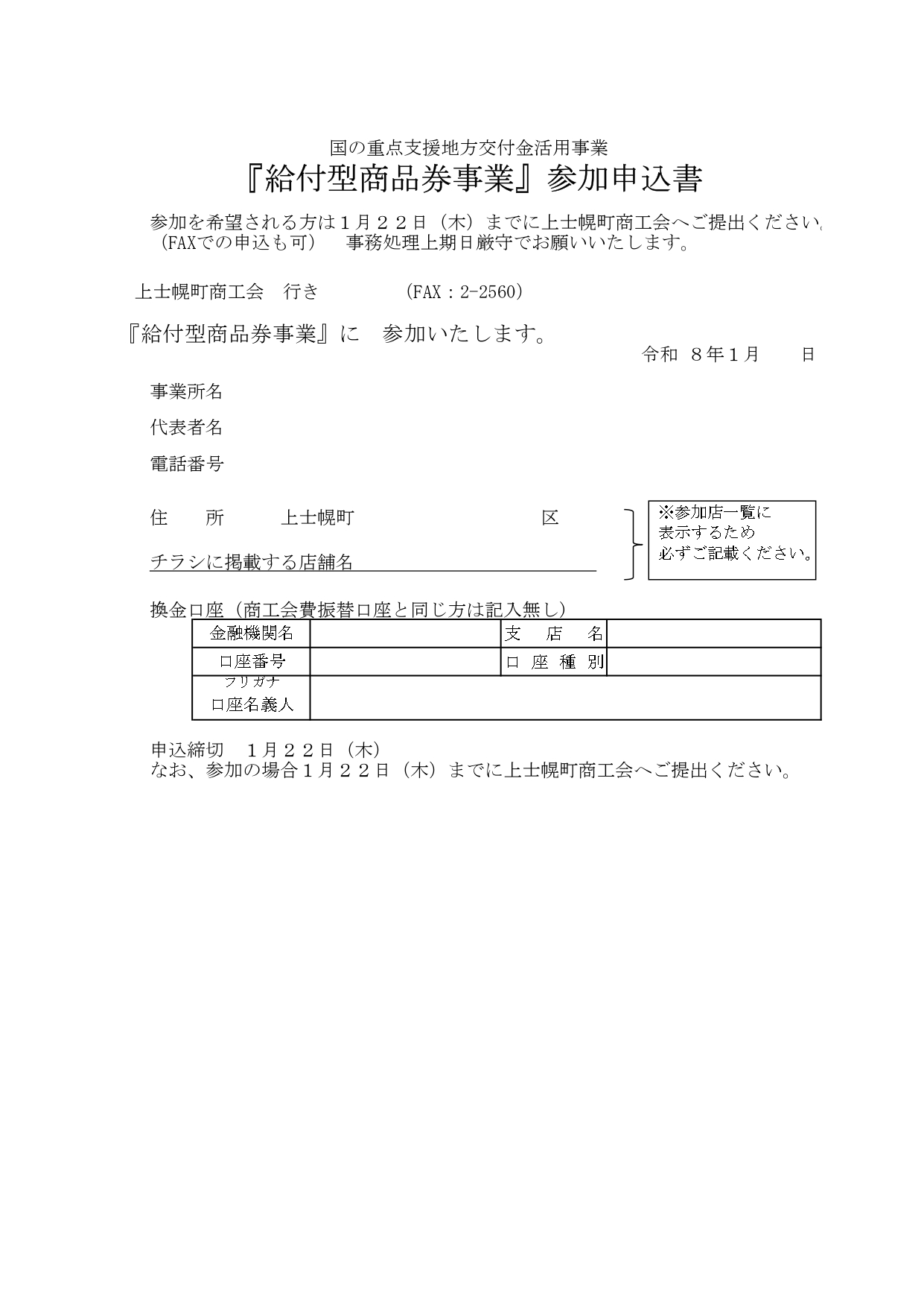 所定の申込書に必要事項をご記入のうえ、上士幌町商工会までご提出ください。 FAXでのお申込みも可能です。